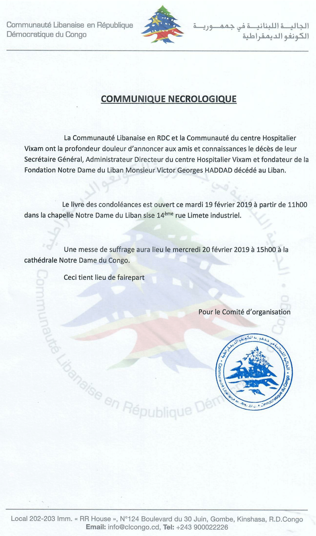 La Communauté Libanaise en RDC et la Communauté du centre Hospitalier Vixam ont la profondeur douleur d’annoncer aux amis et connaissances le décès de leur Secrétaire Général, Administrateur Directeur du centre Hospitalier Vixam et fondateur de la Fondation Notre Dame du Liban Monsieur Victor Georges HADDAD décédé au Liban.
