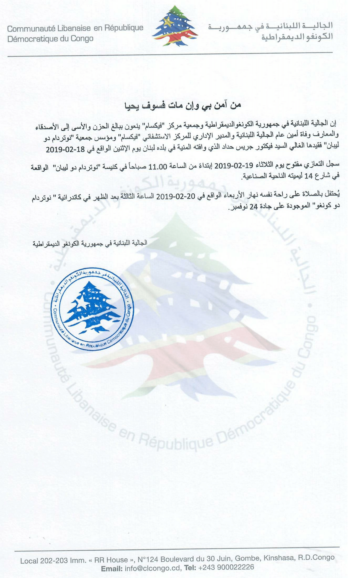 إن الجالية اللبنانية في جمهورية الكونغوالديمقراطية وجمعية مركز "فيكسام" ينعون ببالغ الحزن والأسى إلى الأصدقاء والمعارف وفاة أمين عام الجالية اللبنانية والمدير الإداري للمركز الاستشفائي "فيكسام" ومؤسس جمعية "نوتردام دو ليبان" فقيدها الغالي السيد فيكتور جريس حداد الذي وافته المنية في بلده لبنان يوم الإثنين الواقع في 18-02-2019