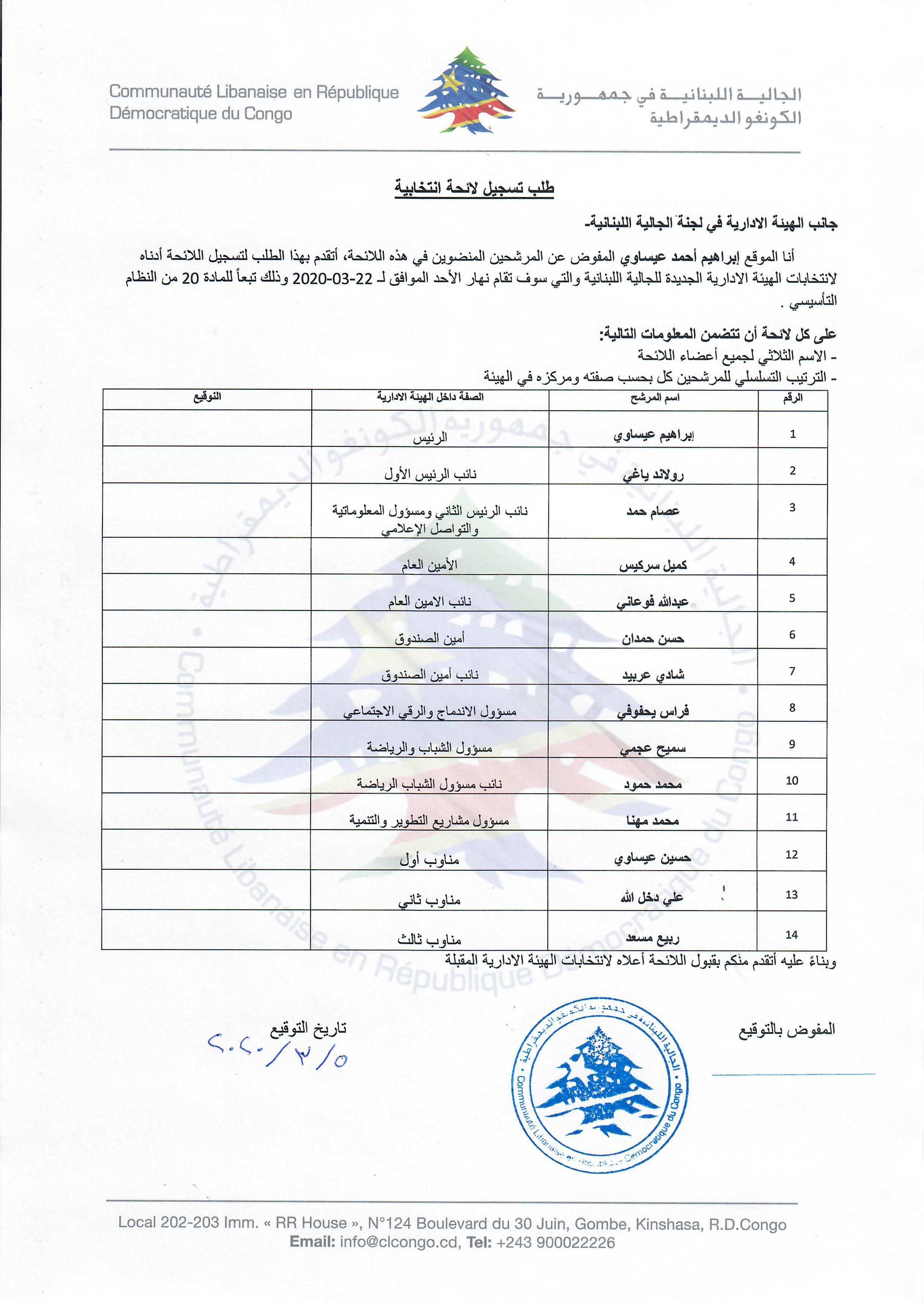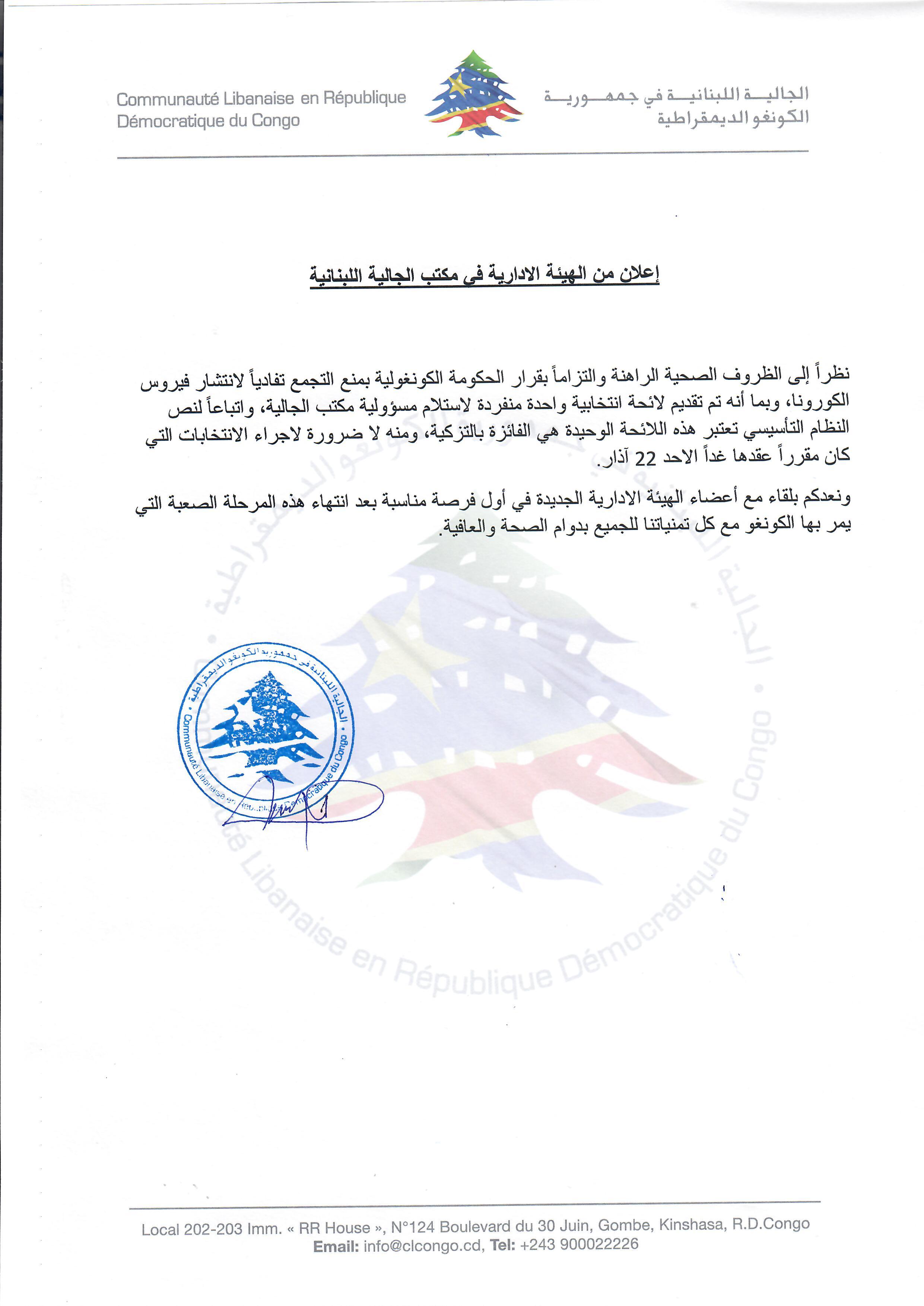 نظرًا إلى الظروف الصحية الراهنة والتزامًا بقرار الحكومة الكونغولية بمنع التجمع تفاديا لانتشار فيروس الكورونا، وبما أن تم تقديم لائحة انتخابية واحدة منفردة لاستلام مسؤولية مكتب الجالية، واتباعًا لنص النظام التأسيسي تعتبر هذه اللائحة الوحيدة هي الفائزة بالتزكية ومنه لا ضرورة لإجراء الانتخابات التي كان مقررا عقدها غدًا الأحد 22 آذار.