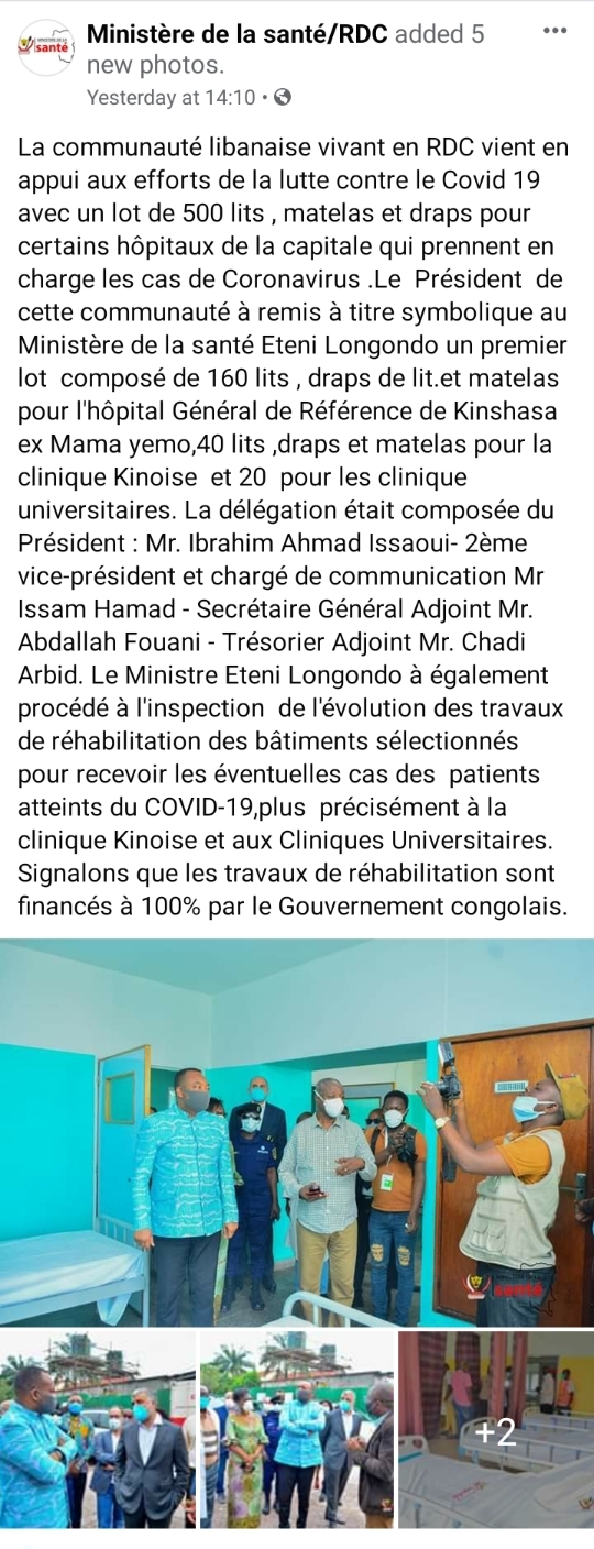 La communauté libanaise vivant en République Démocratique du Congo a donné un lot de 500 lits, matelas et draps au gouvernement congolais. Ce don sera destiné à quelques hôpitaux sélectionnés pour accueillir les éventuels cas positifs au Covid-19.