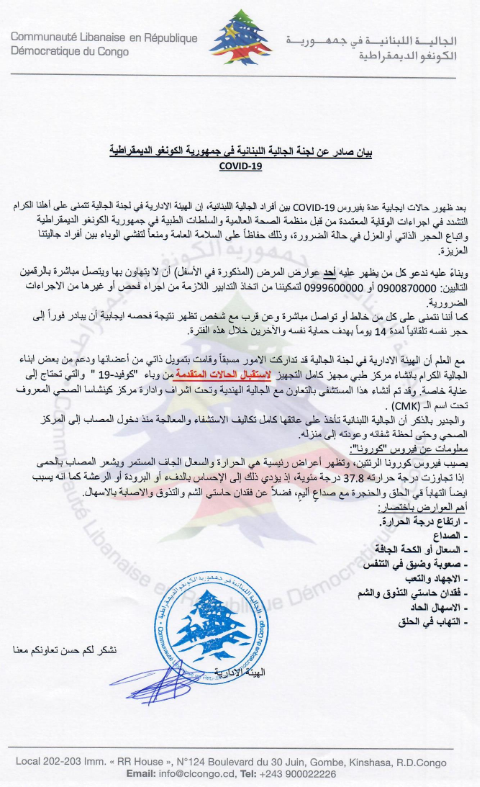 التشدد في اجراءات الوقاية المعتمدة من قبل منظمة الصحة العالمية والسلطات الطبية في جمهورية الكونغو الديمقراطية واتباع الحجر الذاتي أوالعزل في حالة الضرورة، وذلك حفاظاً على السلامة العامة ومنعاً لتفشي الوباء بين أفراد جاليتنا العزيزة.